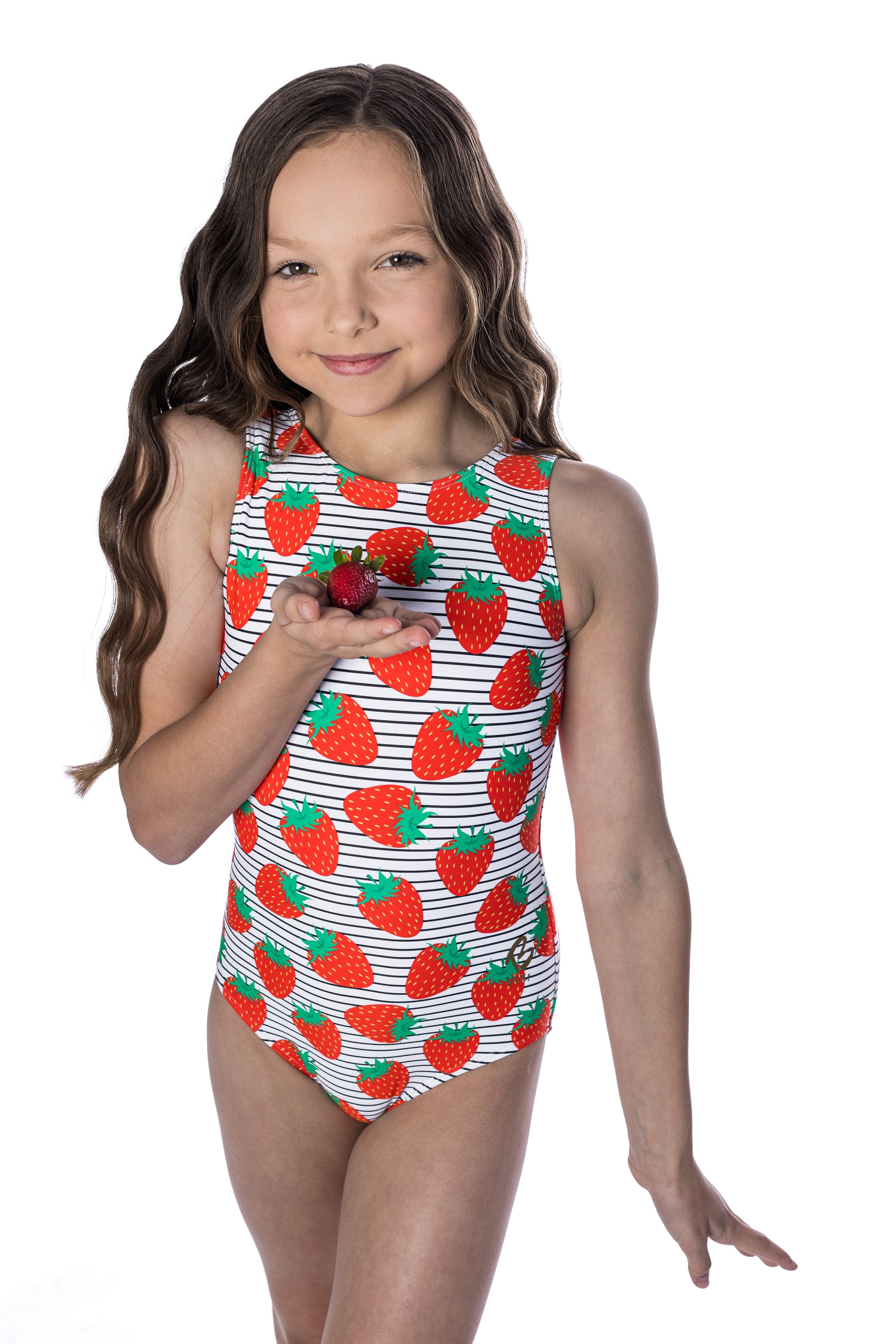 Our Strawberry Gymnastics Leotard is a white leotard with black stripes and features super cute strawberries all over.  The front and back are the same pattern.