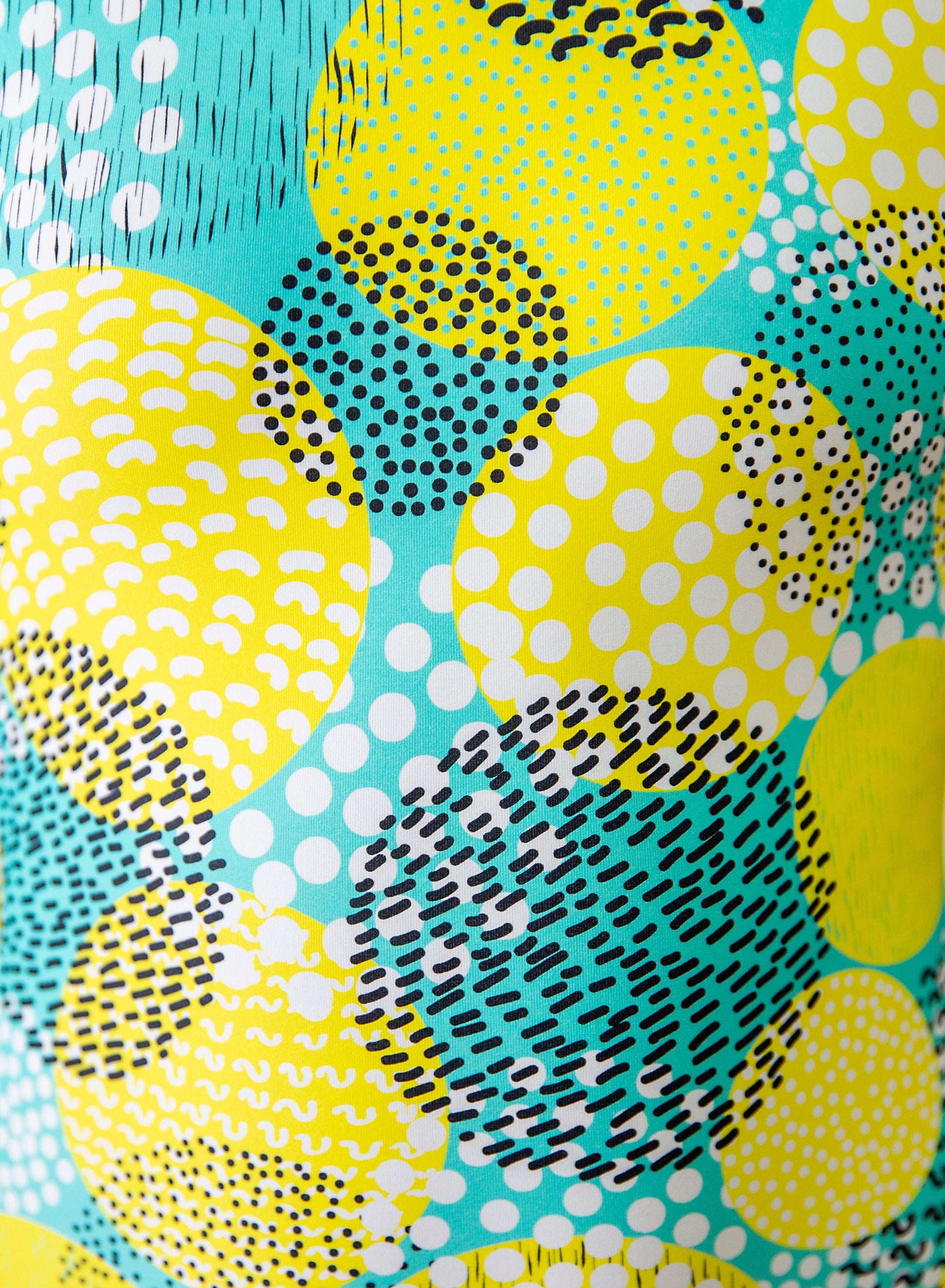 Our Sun Burst Strappy Leotard Swimwear is a bright aqua leotard with bursts of yellow circles and circles of tiny black and white dots. The same pattern is on the front and back and is outlined by black straps.