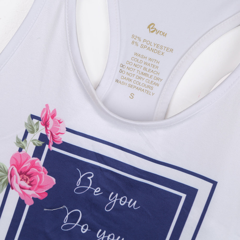 "Be you, do you, for you". This white shirt features a motivational quote on a navy background, bordered by the same pink flowers that match out Floral Check Collection. With a Gold B you logo on the left chest, this top is 92% polyester and 8% Spandex, to keep you feeling comfy all day. Perfect for activewear, or to throw on over a leotard or dancewear, you will even want to wear it to bed!