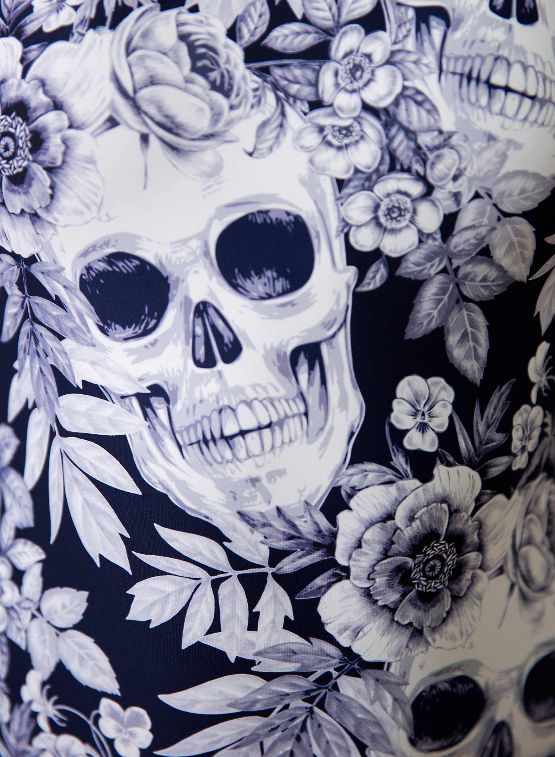 Brought back by popular demand, this one piece features a skull pattern surrounded by roses on a dark background. It is the same pattern on the front and back and is outlined by white edging and white straps.