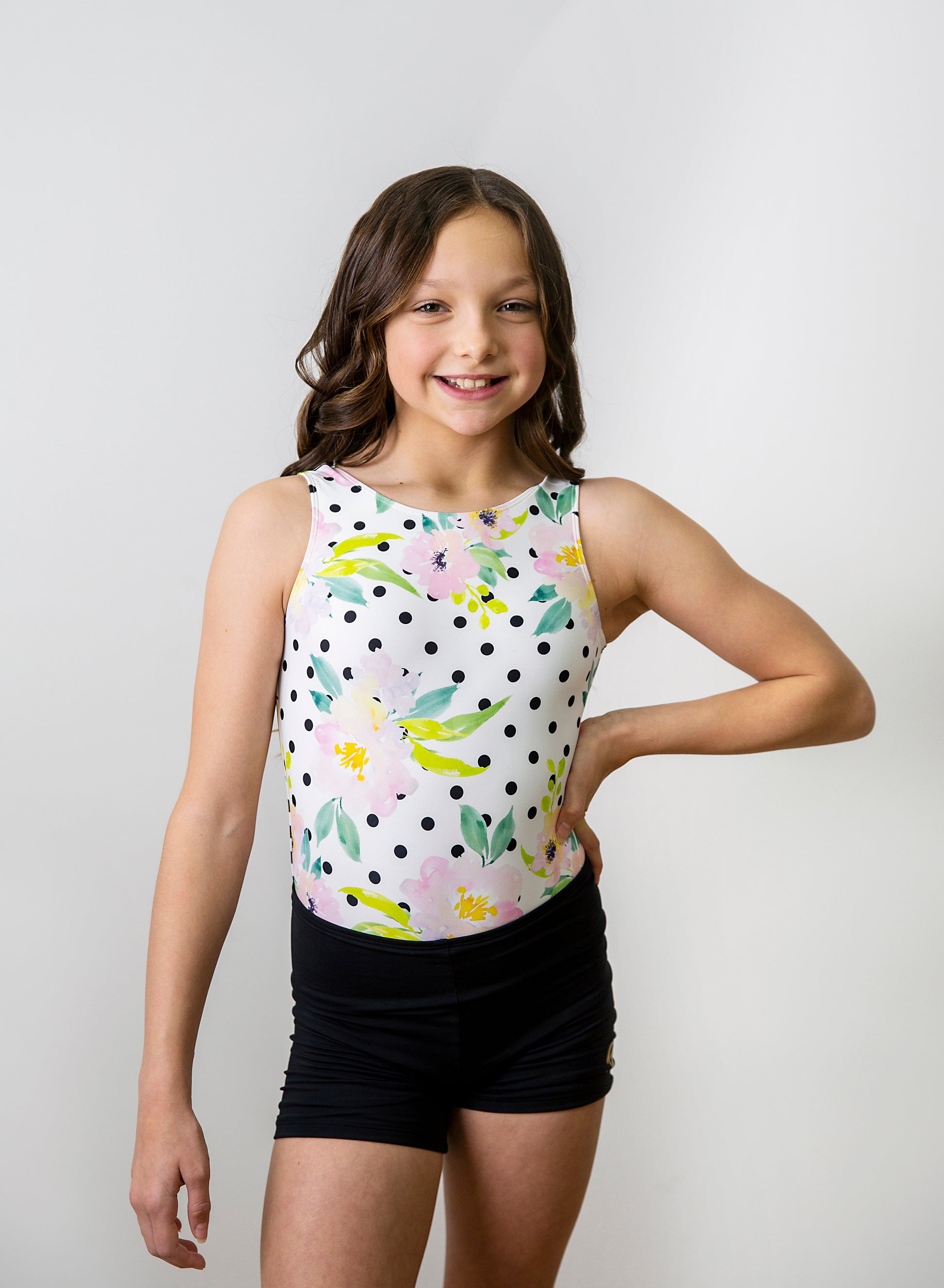 Our Sweet Magnolia Leotard Swimwear features a sweet floral pattern on both sides. The front floral pattern is over the top of a white background with black dots and the back is black and white stripes with the floral pattern on top.